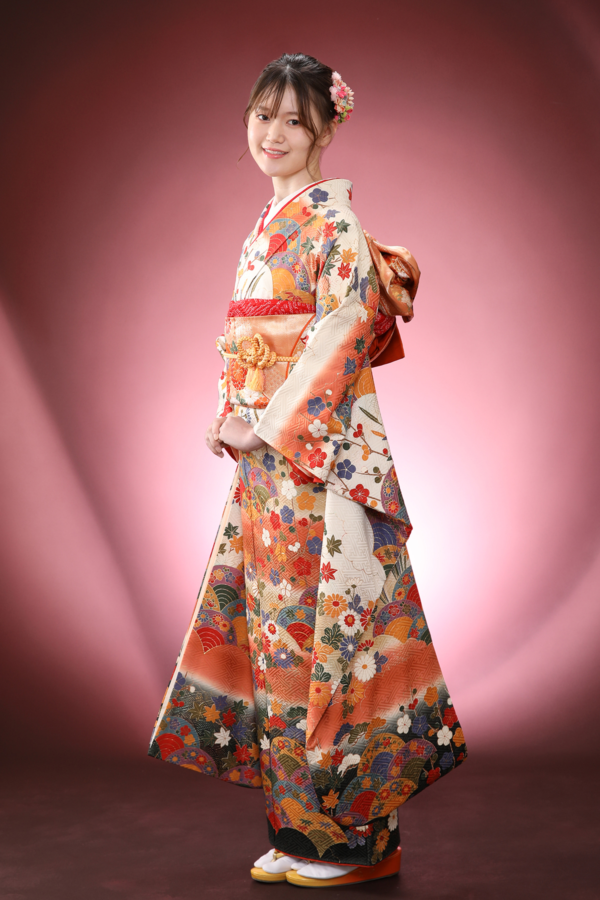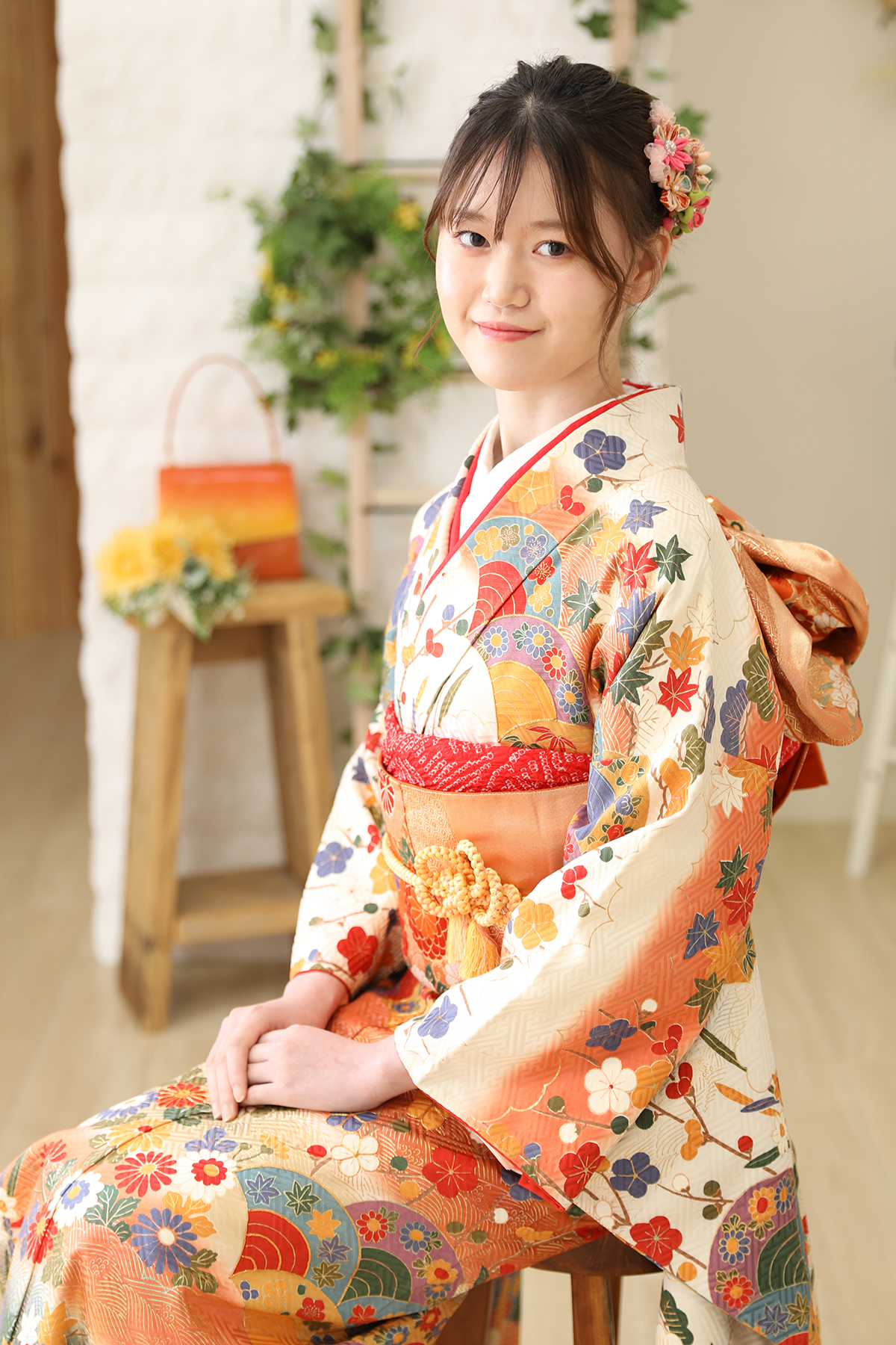 色んな色味や柄が混じっているので、見ているのも楽しくなる振袖ですね(*^▽^*)