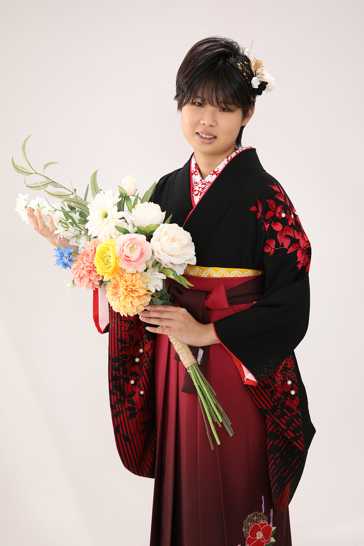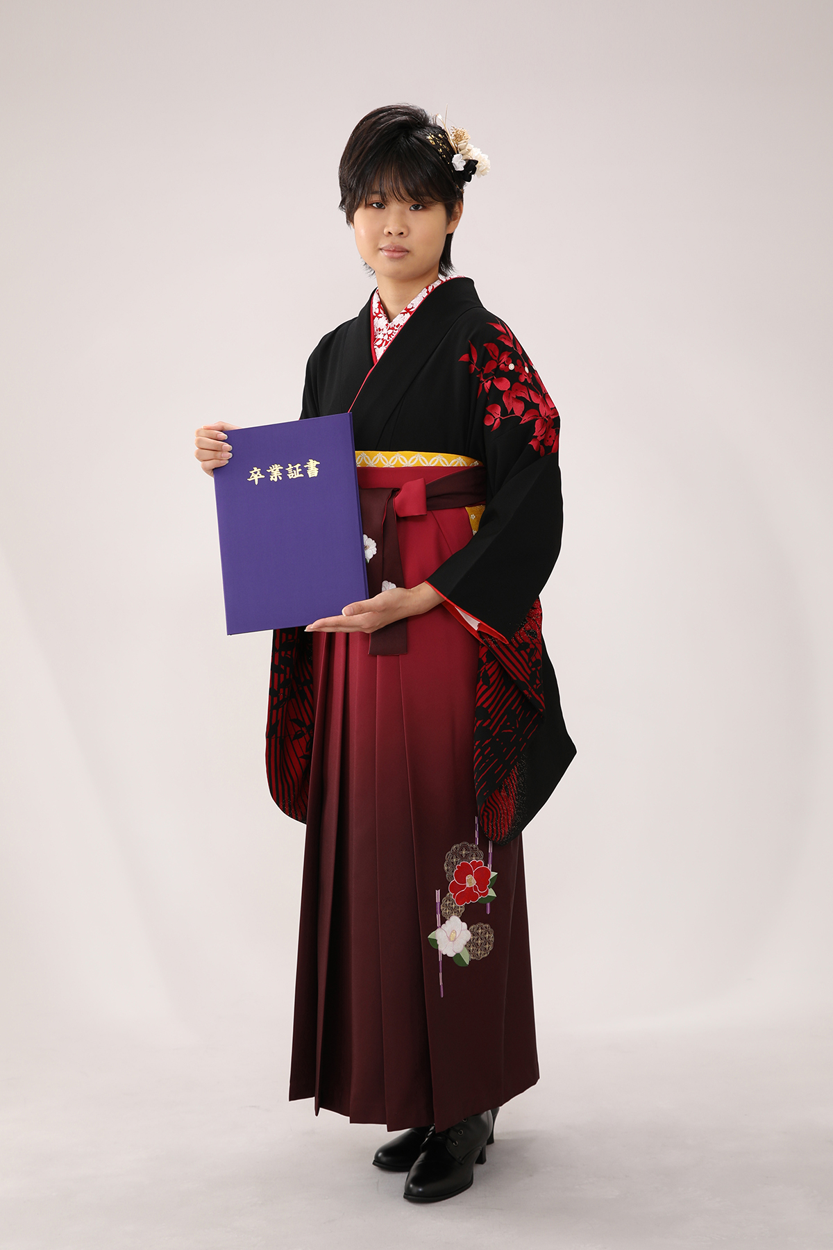 黒のお着物と、エンジの袴の組み合わせで