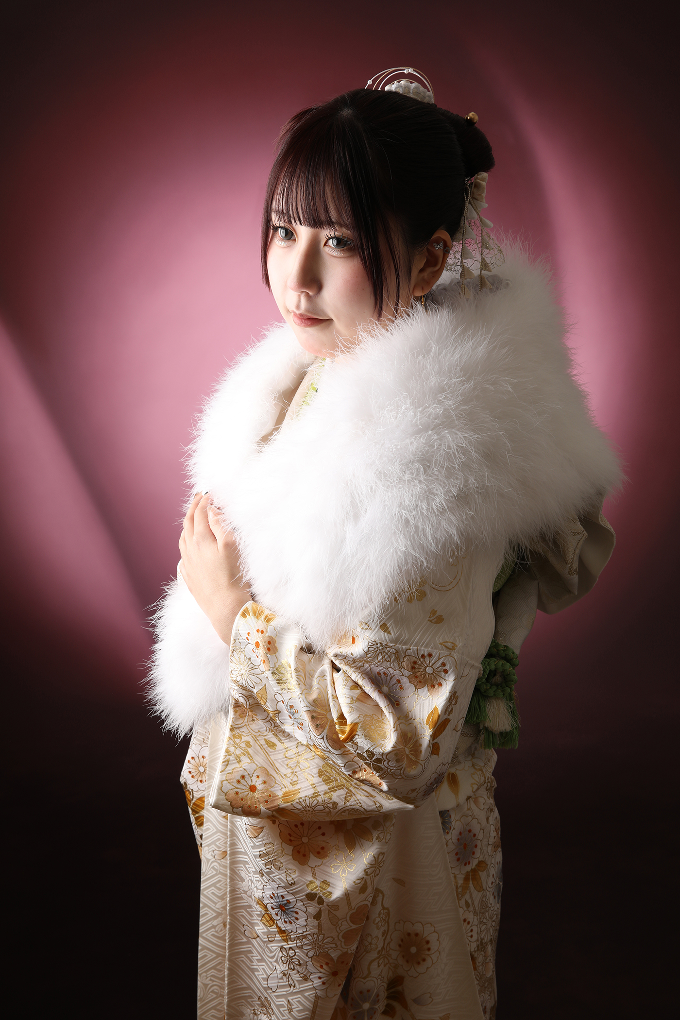 白の振袖に金の柄がとても華やか!綺麗です~😻