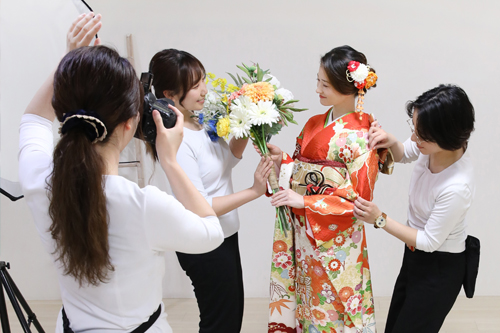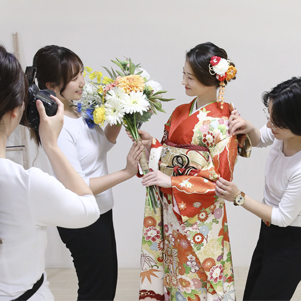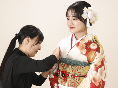 成人の日や前撮り撮影時には経験豊富な振袖専門着付け師が担当します。「着崩れしにくく」「苦しくない」お嬢様の振袖姿を演出します。